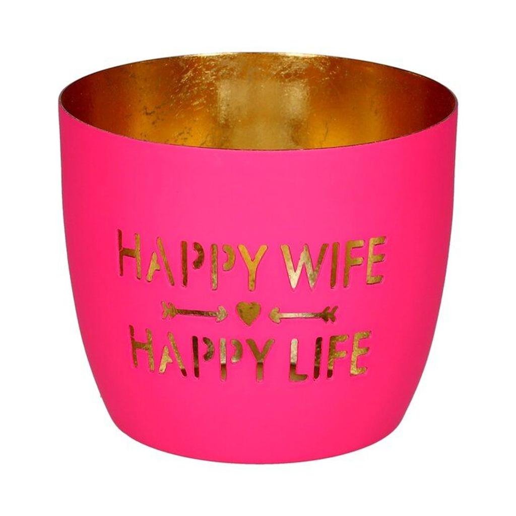 Madras, Windlicht, M, Motiv: Happy wife, happy life, hot pink/gold