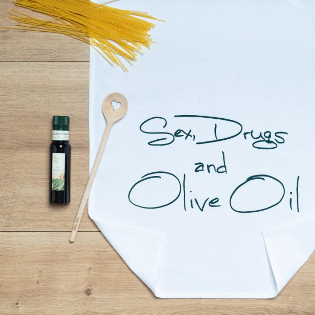 Geschirrtuch weiß, "sex, drugs and olive oil" in grün: