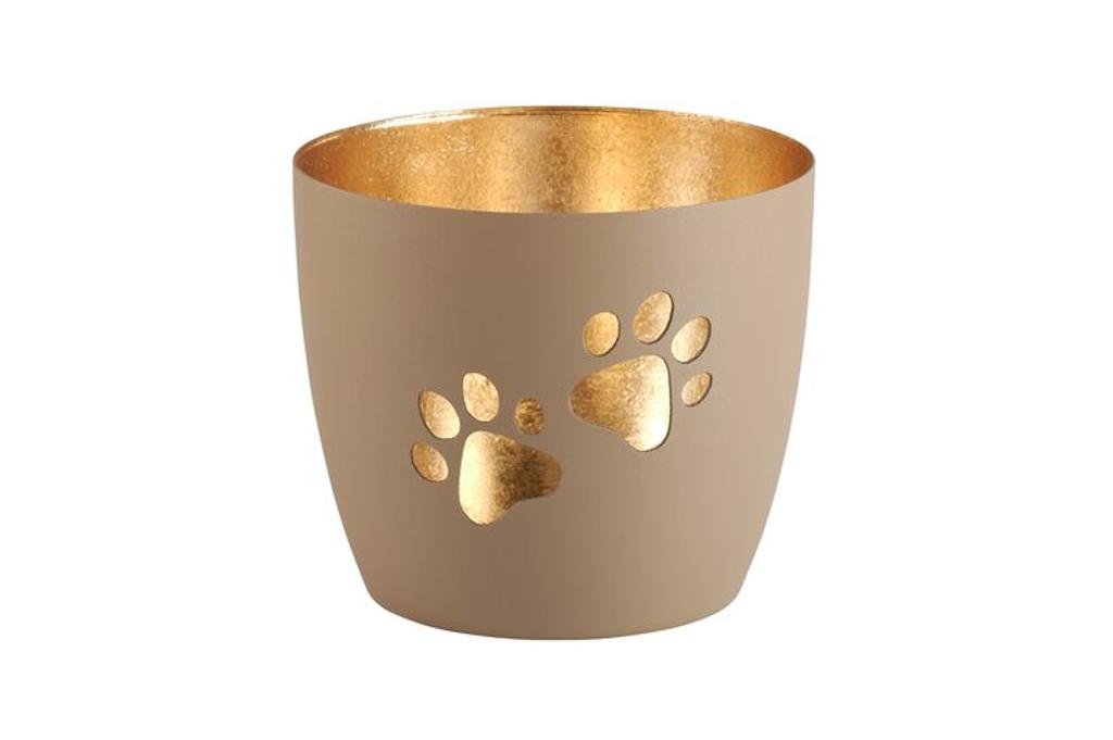 Dieses stimmungsvolle Windlicht der Marke Giftcompany ist aus hochwertigem Eisen gefertigt und mit einem Design von Pfotenabdrücken verziert. In den Farben Sandstein und Gold gehalten, verleiht es jedem Raum eine warme und gemütliche Atmosphäre. Das Windlicht hat eine Größe von H8,5cm und einen Durchmesser von D10cm.